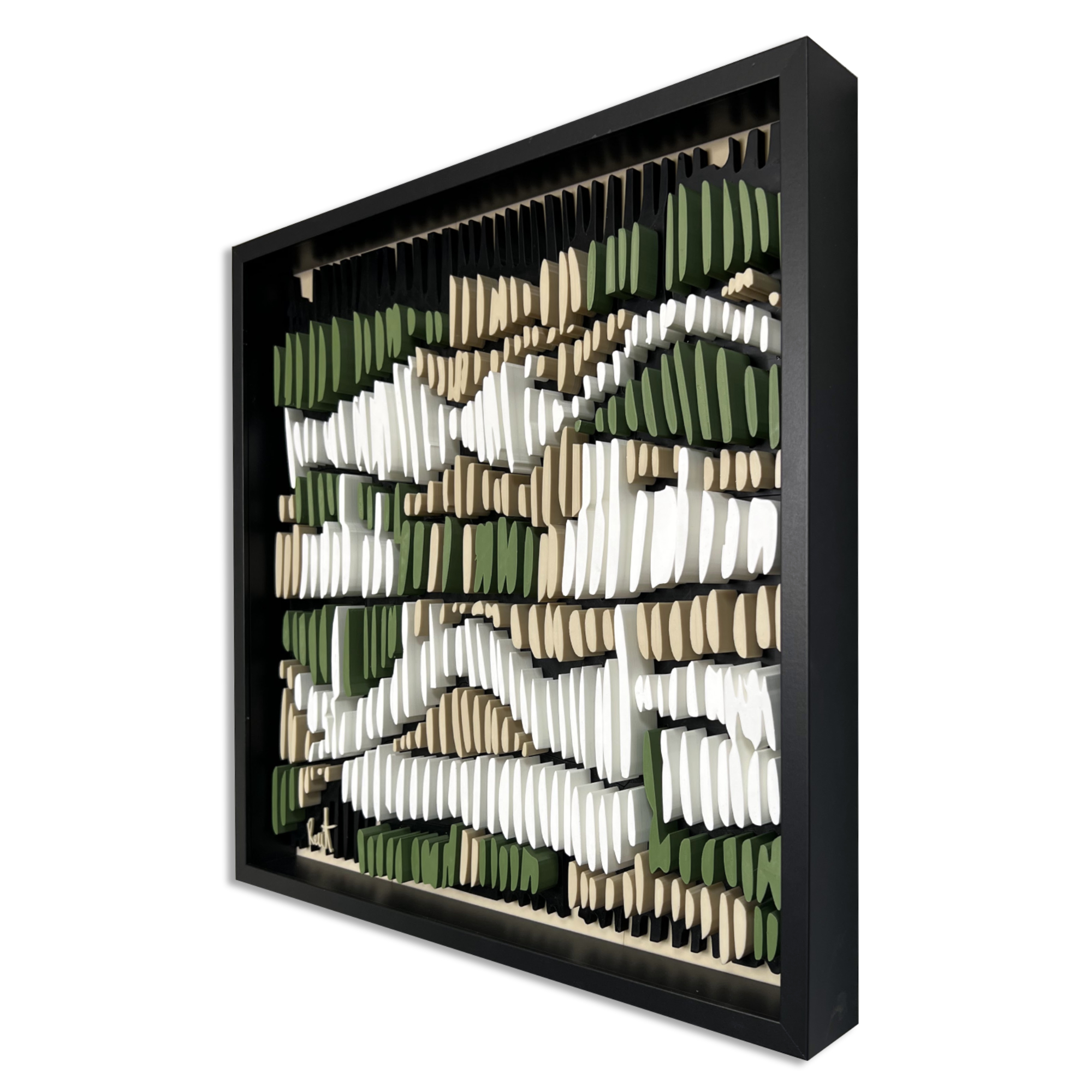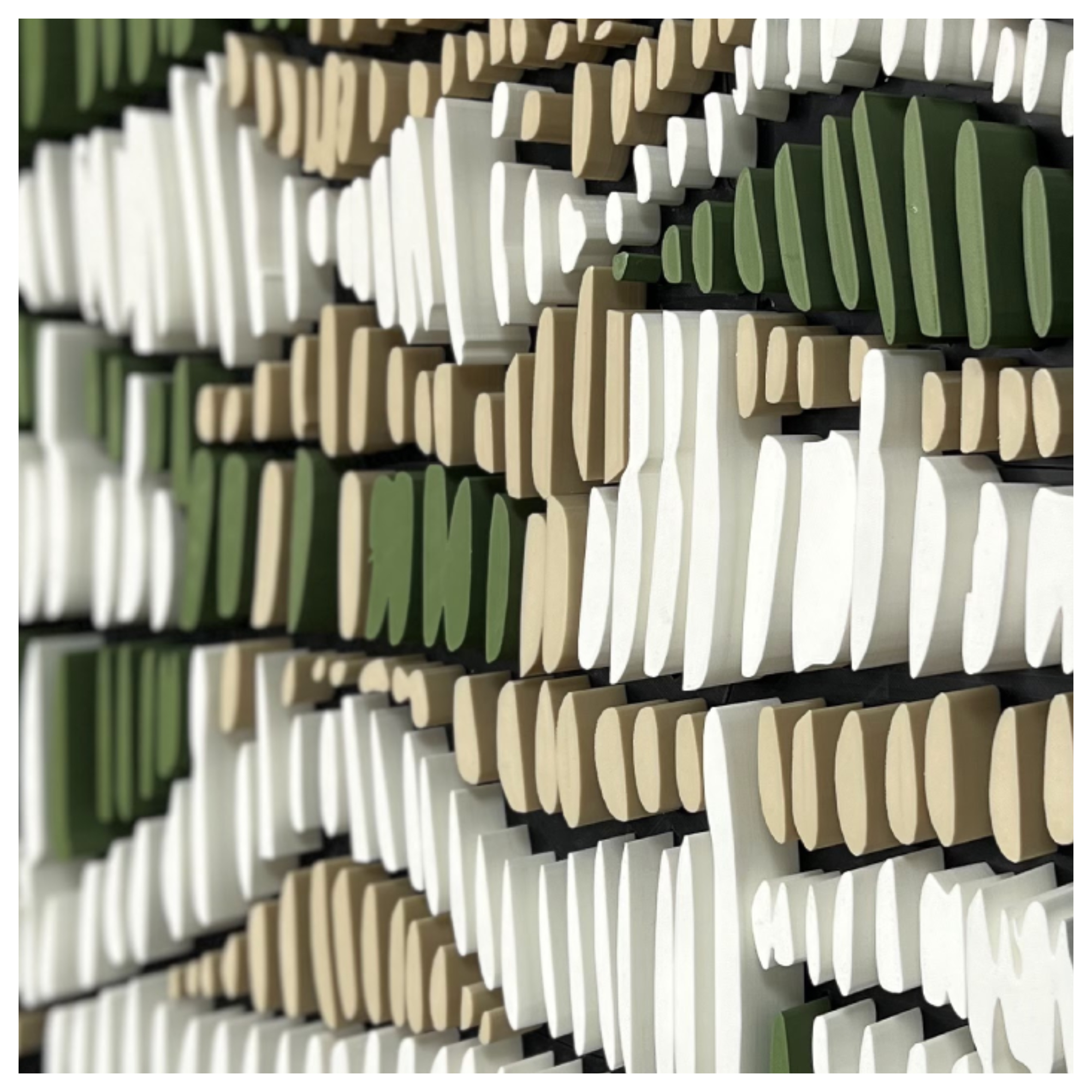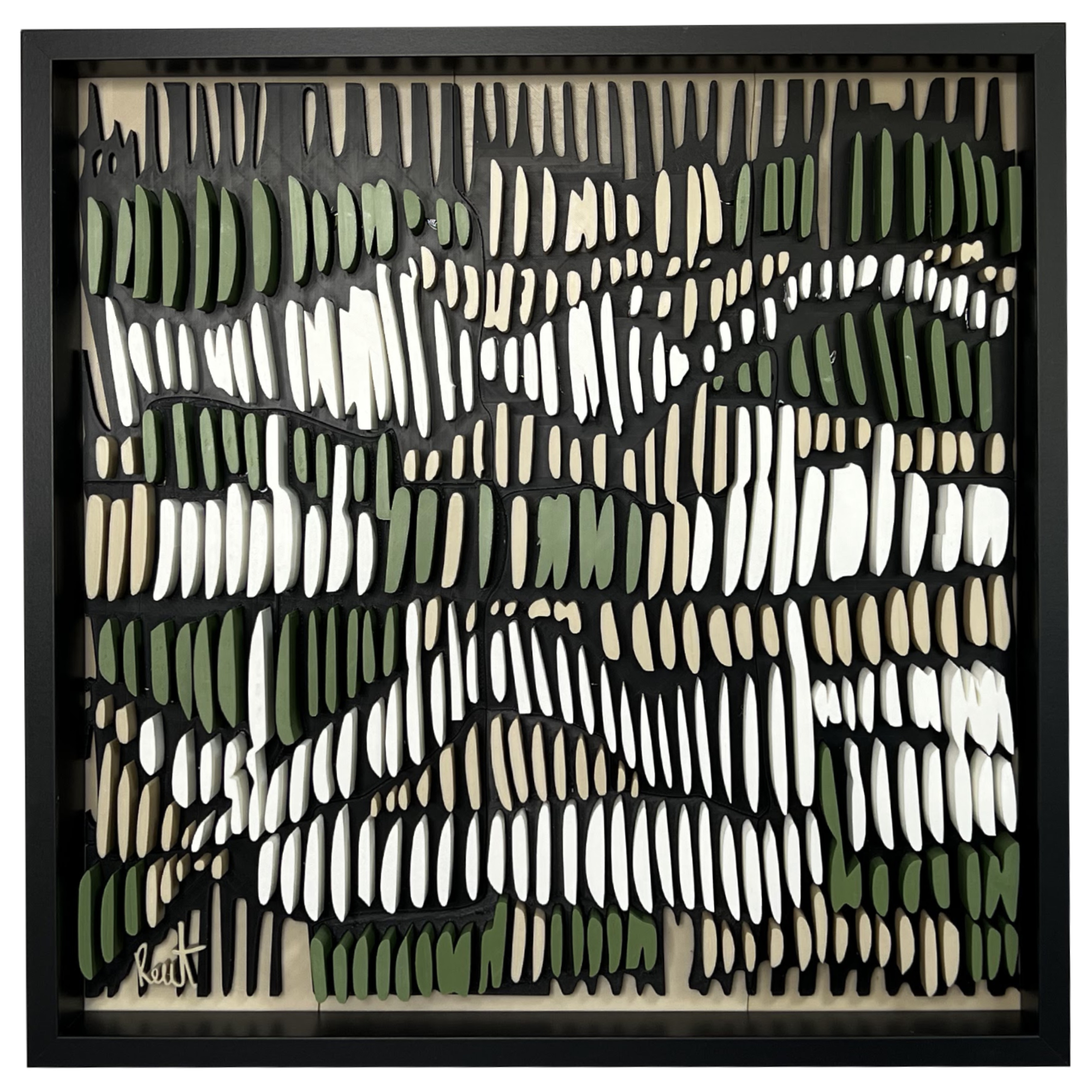 This 3D artwork captures the essence of intuitive mark-making, echoing the repetitive pencil strokes often found in early design sketches. Each raised element plays with light and shadow, forming a rhythmic pattern that shifts with perspective. The interplay of natural tones, earthy greens, soft whites, and deep neutrals, evokes a meditative sense of movement and depth, bridging the tactile and the visual.