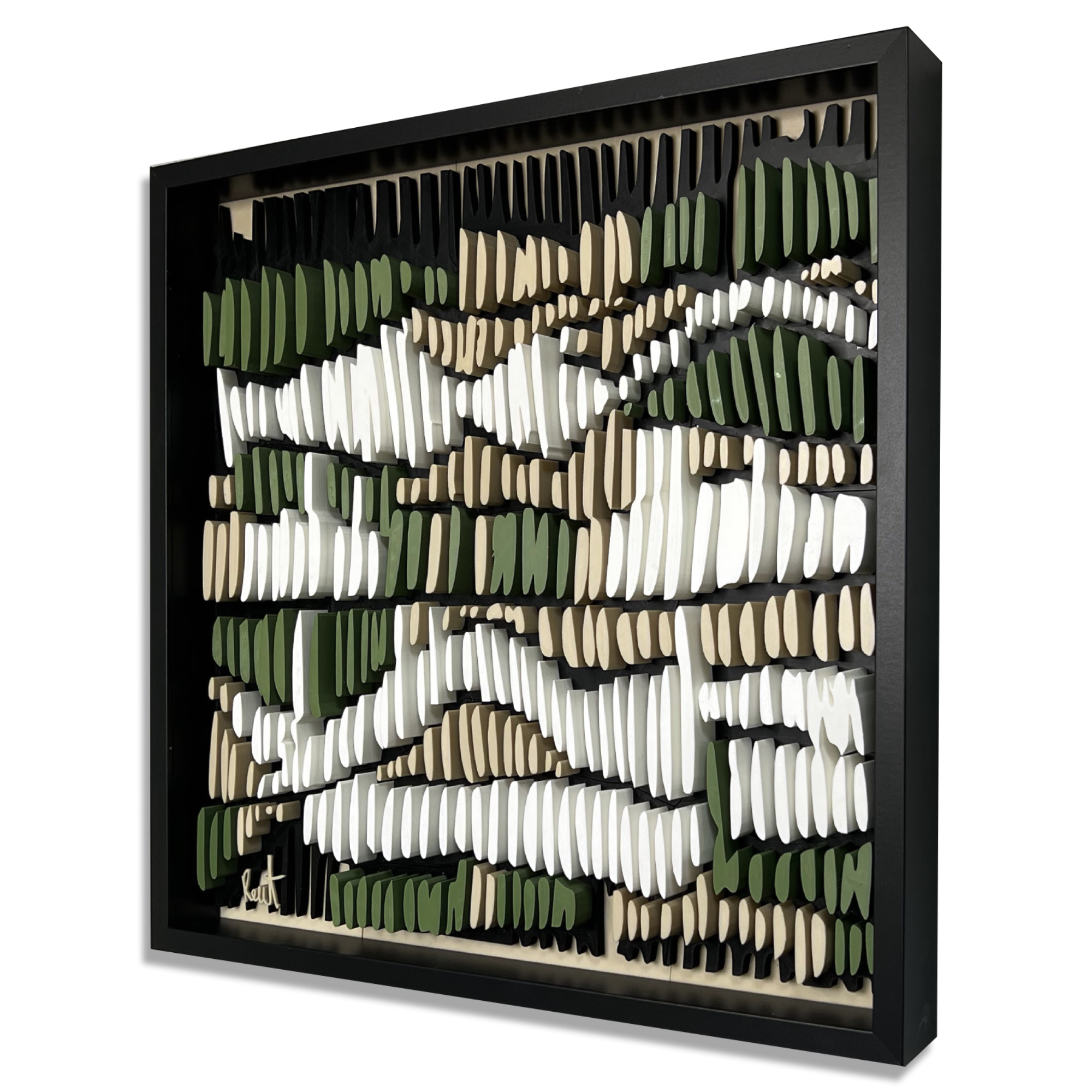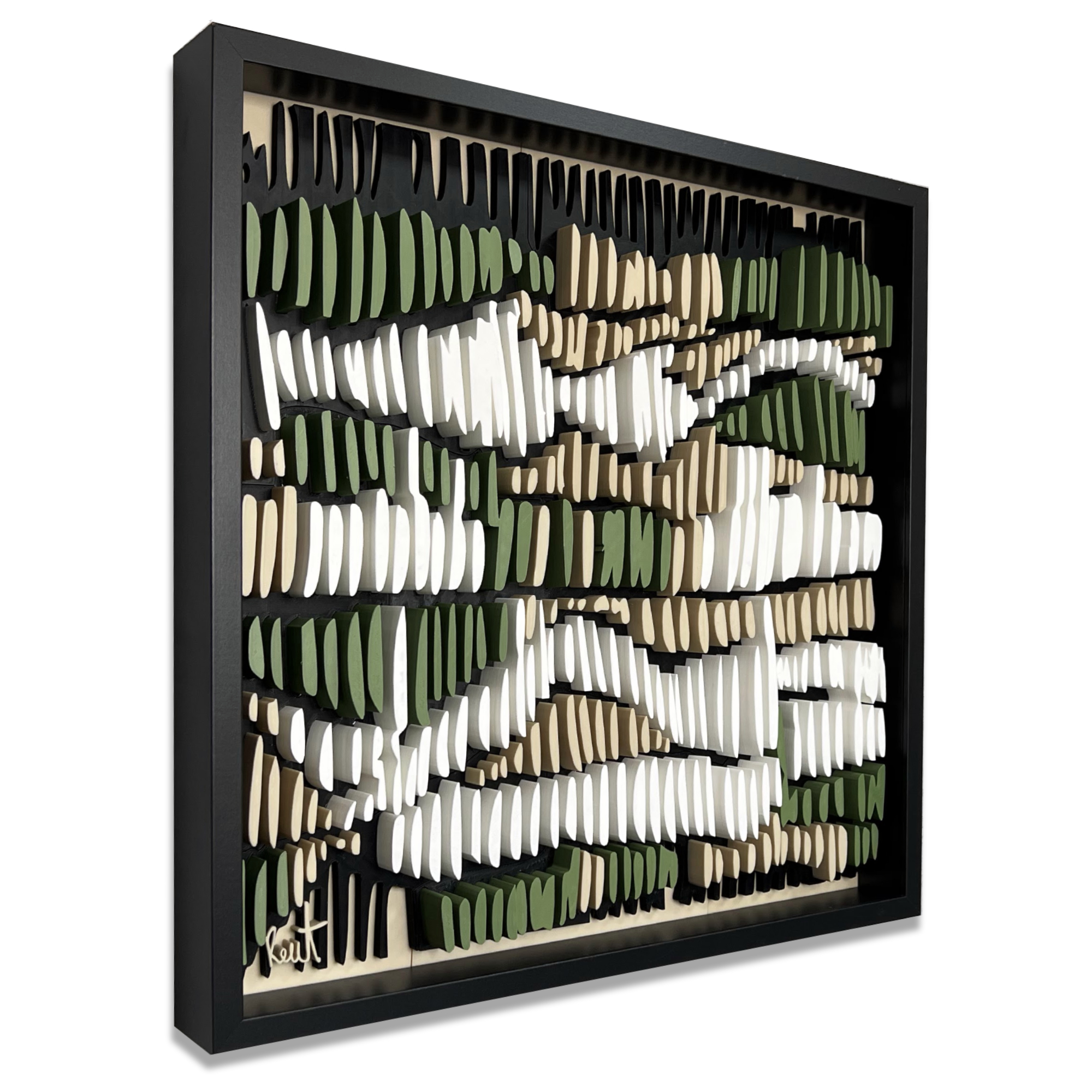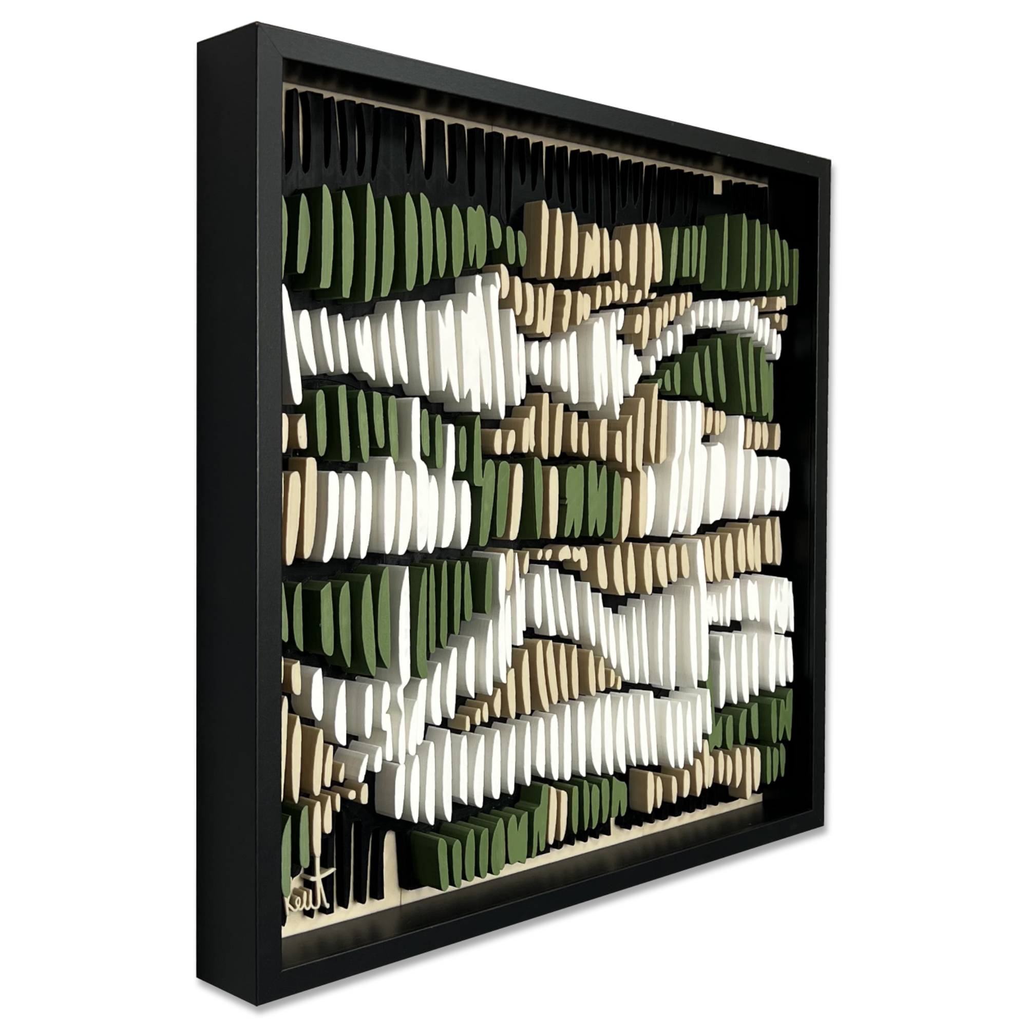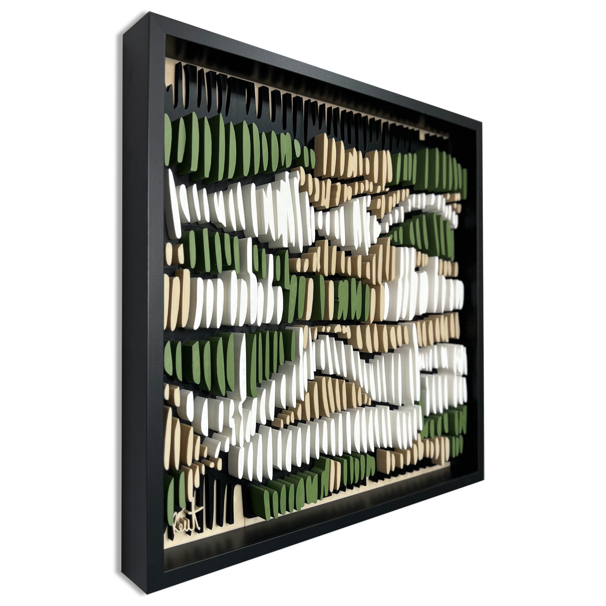 This 3D artwork captures the essence of intuitive mark-making, echoing the repetitive pencil strokes often found in early design sketches. Each raised element plays with light and shadow, forming a rhythmic pattern that shifts with perspective. The interplay of natural tones, earthy greens, soft whites, and deep neutrals, evokes a meditative sense of movement and depth, bridging the tactile and the visual.